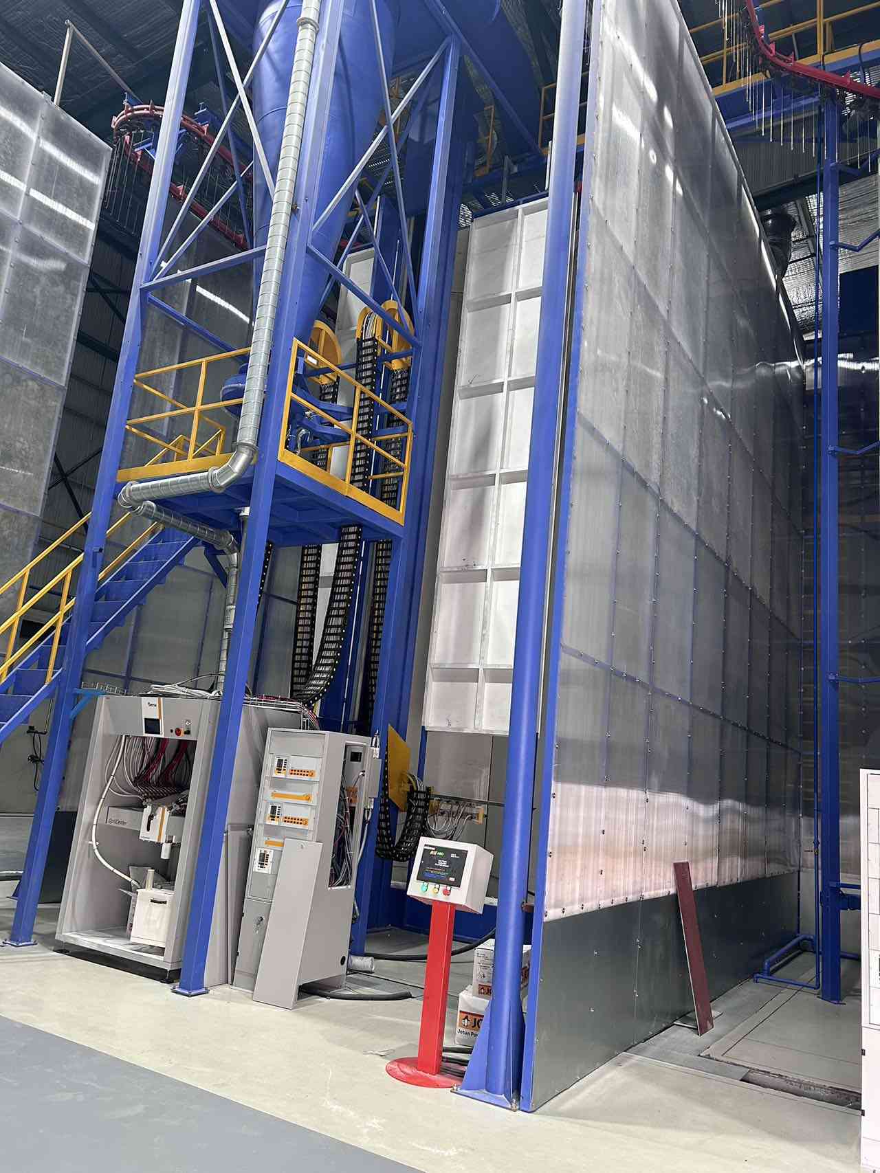 主要な構成要素:パウダーコーティング 吊りコンベアシステム,積載・卸載システム,予備処理,乾燥炉,パウダーコーティング室とリサイクルシステム,固化炉,電気制御システム,パウダーコーティングガン,粉末供給センター空気圧縮機,DI 水機システムなど